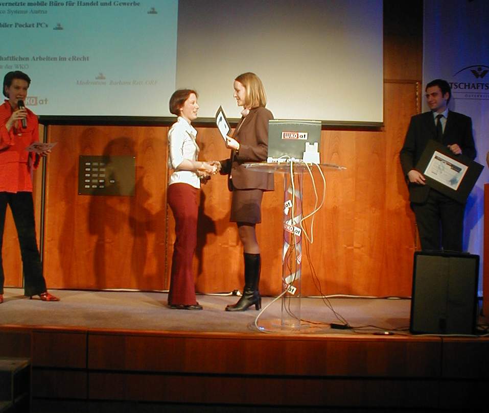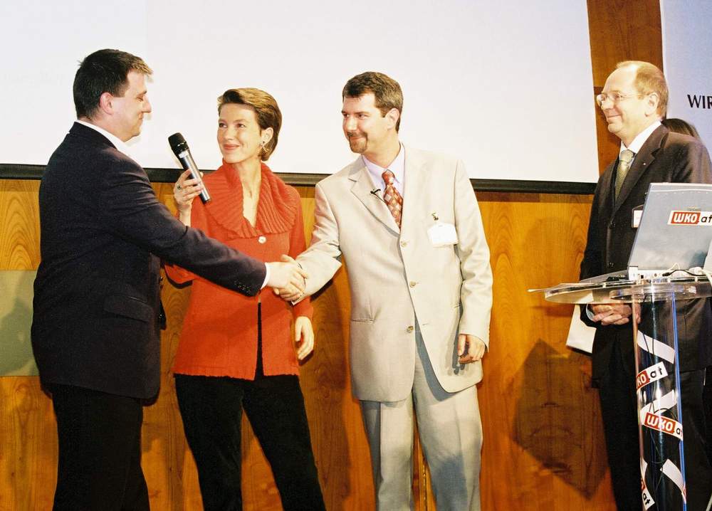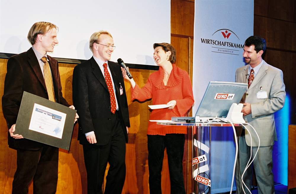 Barbara Rett interviewt den Preisträger Harald Krassnigg, daneben WKÖ Vertreter Christian Rupp und Preisträgerin Bettina Stomper, rechtsprobleme.at Betreiber Gerhard Laga |