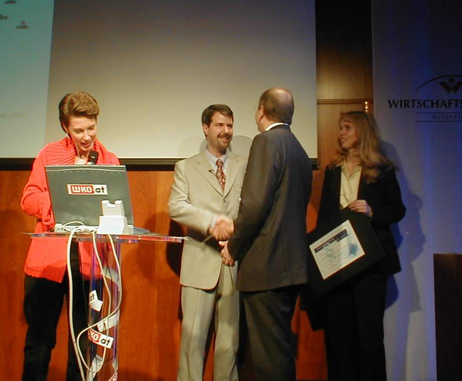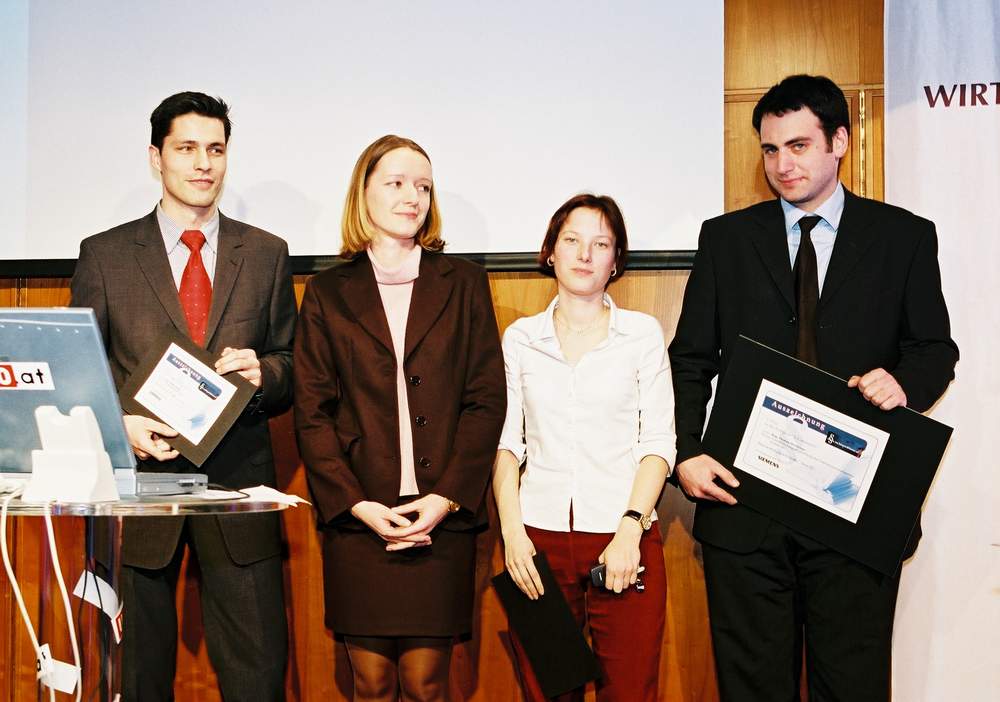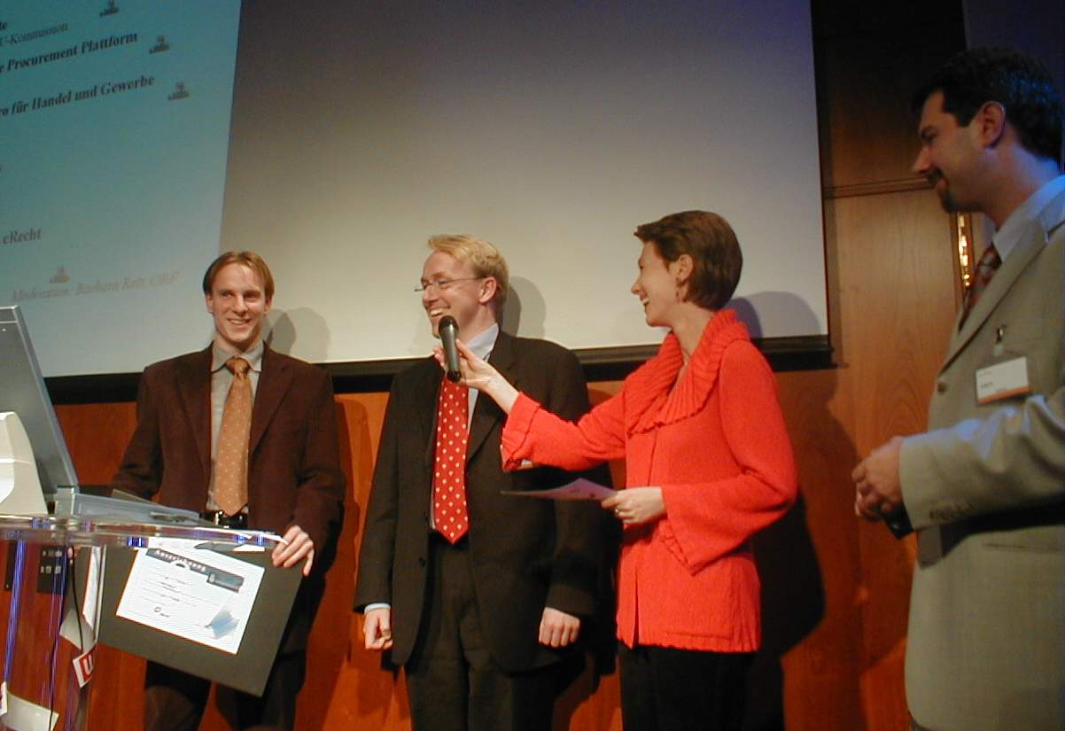 Links neben Barbara Rett die Preisträger in der Kategorie Telekom: Herwig Höllinger und Rene Tritscher, daneben Hr. Ulihr von T-mobile.at. |